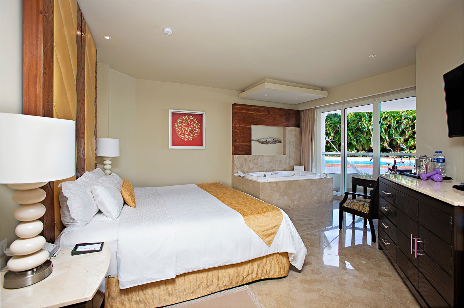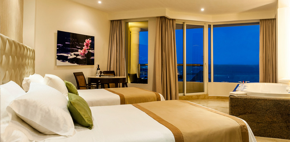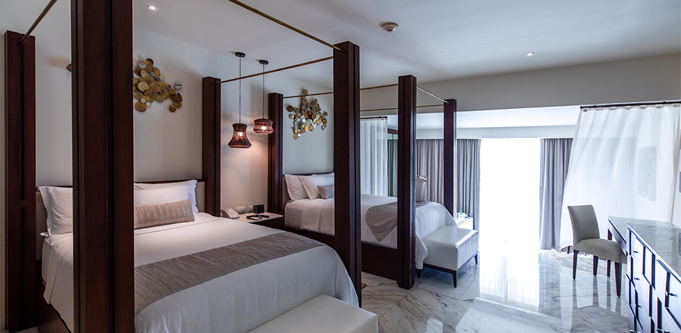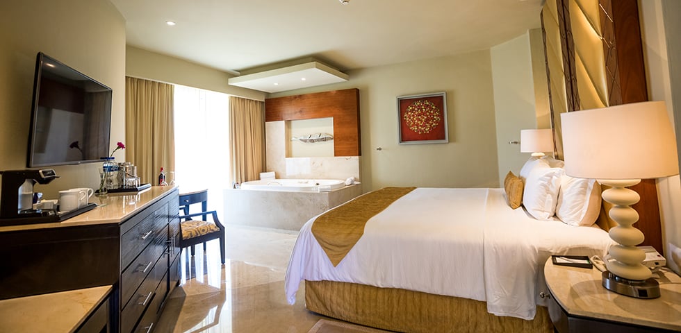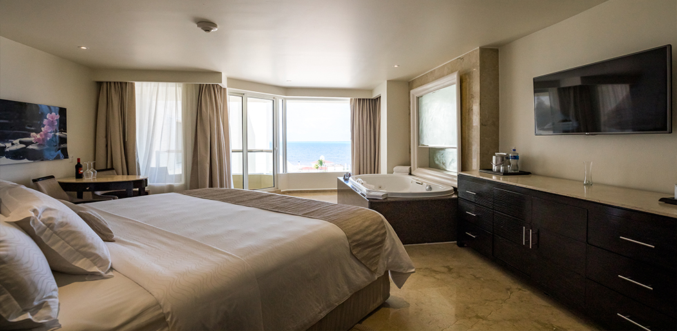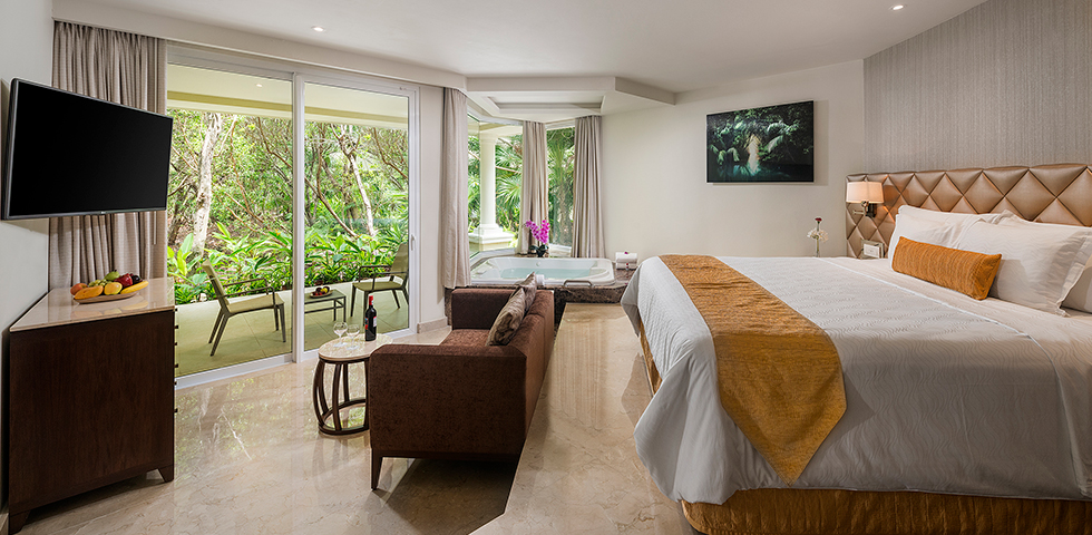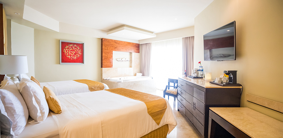 Take in beautiful views of the resort from your private balcony or patio, then come inside to unwind in your private double whirlpool tub. This room type is available at Sunrise and Nizuc.
