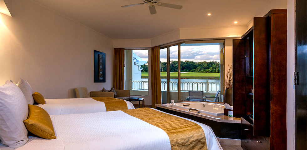 Please note that no room-types, including this one, include room-specific golf carts. However, guests in this room-type will receive golf cart shuttle access from their room to other sections of the resort throughout their entire stay. Access to the Moon Palace’s world-class golf course is not included in the package price.